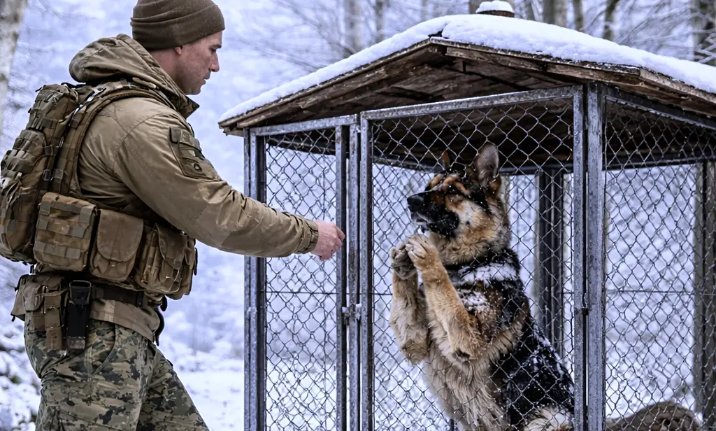 The cold attacked immediately, but his breathing remained rhythmic. He approached with caution, his hand drifting near his belt out of muscle memory, though the only visible enemy was the wind. Inside the enclosure stood a dog, a German Shepherd, full-grown and powerfully built despite its diminished condition.