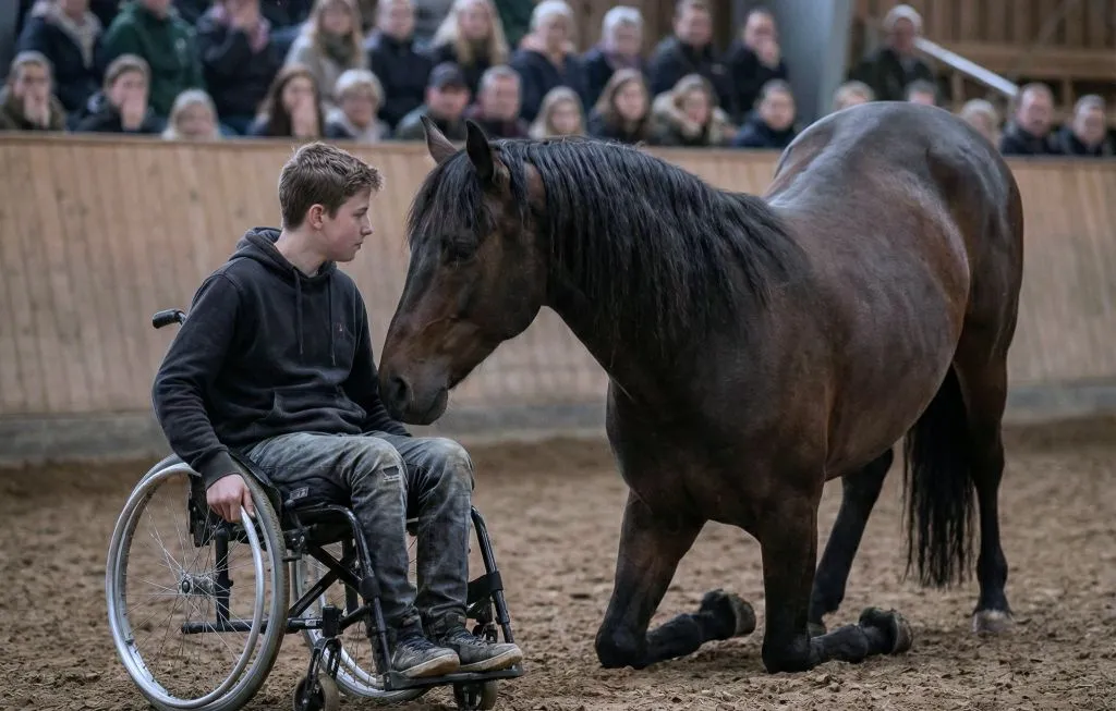 He bent his powerful forelegs, and with a grace that belied his immense size, the wild stallion knelt before the paralyzed boy in the wheelchair. The silence that followed was deafening and absolute. The crowd, moments before a source of mockery, was now utterly frozen, mouths agape and eyes wide with stunned incredulity.